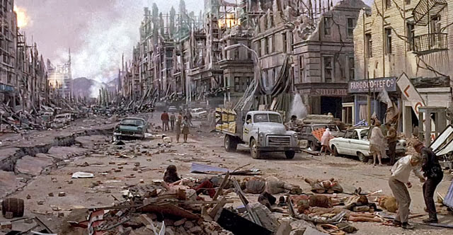I thought I’d do a comparison of two similar films from different eras that exploit people’s fondness for destruction: 1974’s Earthquake and last year’s San Andreas. Both revolve around earthquakes blind-siding California and people’s struggles to survive. Both include experts who saw the quake coming but didn’t act fast enough, crumbling cityscapes, characters getting trapped in a parking garage, and a dam’s destruction and subsequent deluge (one at the beginning, one at the climax). While a few of the shaking scenes are even similar (both show a glimpse of a cook suffering at the hands of his stove), the two films are on entirely different levels. Earthquake was groundbreaking at the time and even won an uncontested Oscar for Best Visual Effects, but it seems quaint next to the comprehensive devastation of San Andreas, which is ironic since the quake in Earthquake is a 9.9 on the Richter scale while those in San Andreas only reach 9.6. (Yeah, only.)